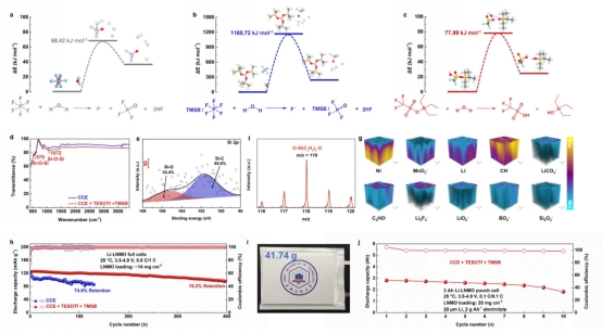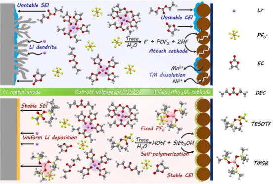 无钴锂镍锰氧化物(LiNi0.5Mn1.5O4,LNMO)正极因其高工作电压(约4.7 V)和低成本,被认为是高能量密度储能系统的理想候选。然而,传统碳酸酯电解液难以在高电压下保持稳定,且与电极兼容性差,限制了其实际应用。因此,团队提出一种协同抑制策略,在常规电解液中引入两种硅基添加剂——三乙基硅基三氟甲磺酸酯(TESOTf)与三(三甲基硅氧基)硼酸酯(TMSB),实现了Li-LNMO电池在4.9 V高电压下的稳定循环。研究表明,TMSB可络合游离的六氟磷酸根阴离子(PF6⁻),而TESOTf优先与痕量水反应,从而抑制锂盐六氟磷酸锂(LiPF6)的水解及氢氟酸(HF)的生成,减少正极副反应。电化学测试表明,该电解液显著提升了Li-LNMO电池的倍率性能(10C下85.2 mAh g⁻¹)、循环寿命(5C循环500次容量保持80%)及高温稳定性(60°C、5C循环300次)。基于此策略组装的3 AhLi-LNMO软包电池能量密度超过300 Wh kg⁻¹。该研究不仅揭示了硅基添加剂在高电压正极保护中的协同作用机制,也为高能量密度锂电池的开发提供了新路径。