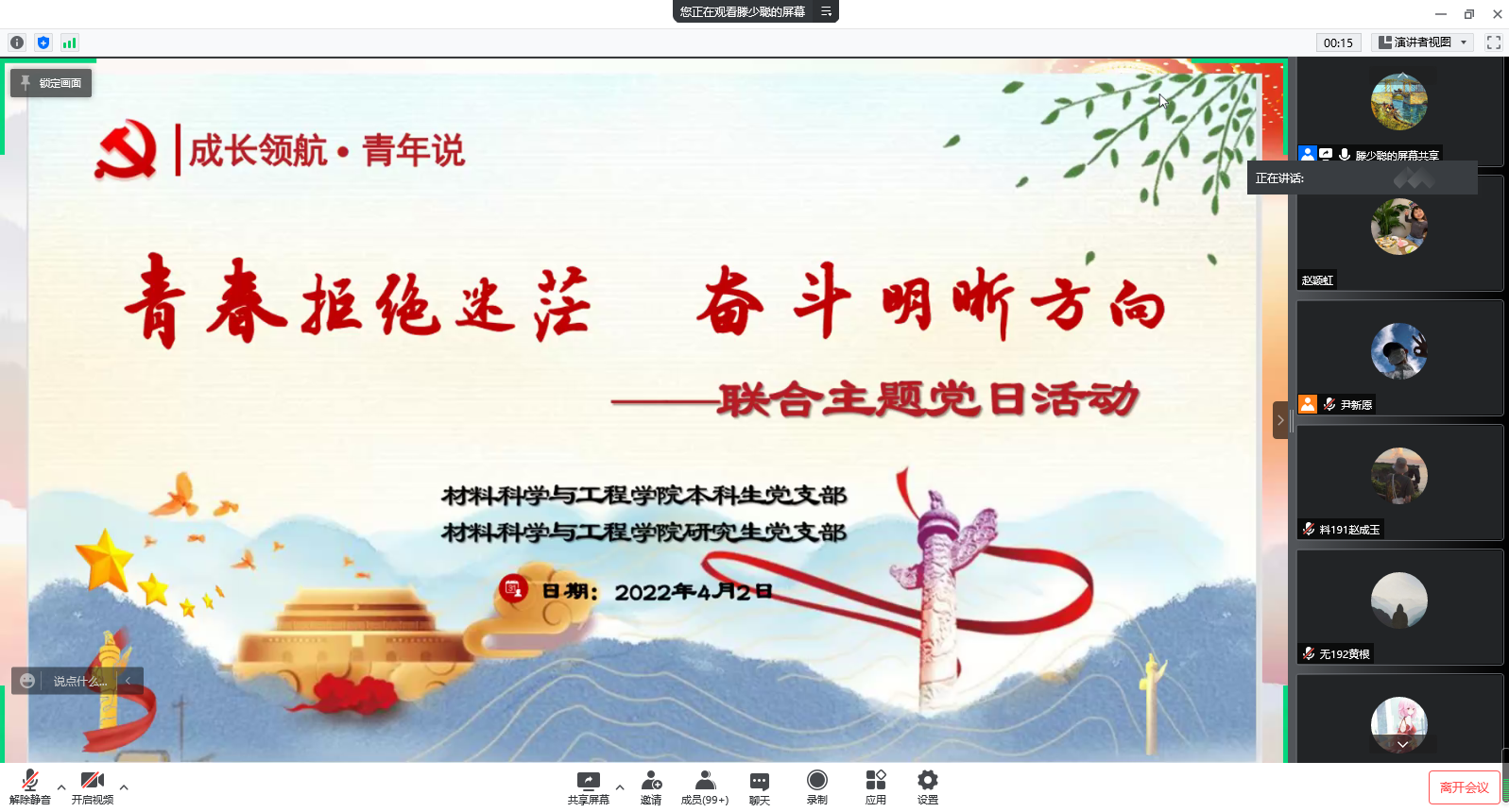2022年4月2日下午14:30,材料学院举行“成长领航∙青年说”联合主题党日活动。邀请材料学院研究生支部博士生党员蔡振飞担任主讲,材料学院本科生各支部党员,材料学院研究生支部全体党员,部分材料学院师生参与了本次活动。
