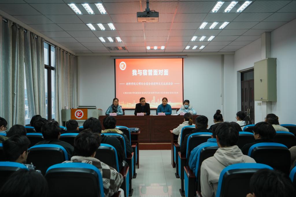 为进一步推进文明安全宿舍创建工作,加强学生文明安全意识培养,11月30日,材料学院联合后勤处召开“我与宿管面对面”文明安全宿舍创建师生交流座谈会。后勤处学生公寓管理服务中心主任涂必华、部分学生公寓管理员、材料学院党委副书记赵颖虹、全体辅导员及各年级学生代表参加座谈会,材料学院团委书记张佩佩主持会议。