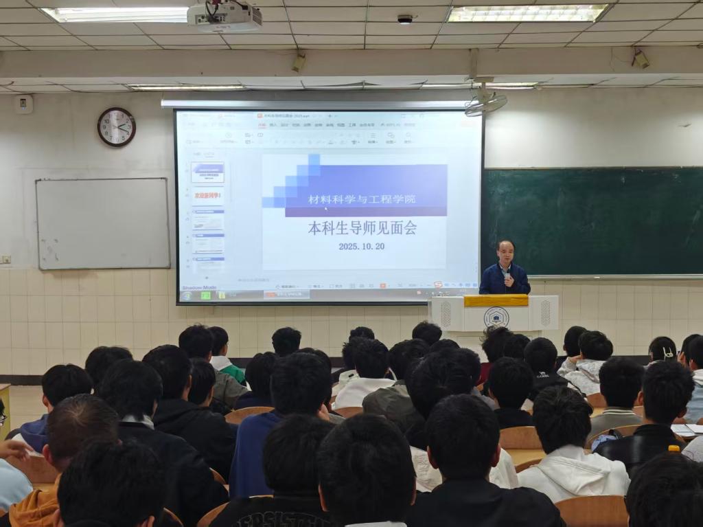 为帮助2025级新生快速适应专业学习、明晰学业发展方向,10月20日下午,材料学院在秀山校区阶教101教室开展了2025级本科生导师见面会。学院副院长夏爱林、各系主任、各班班主任、全院本科生导师、2025级辅导员及全体新生到场参加。