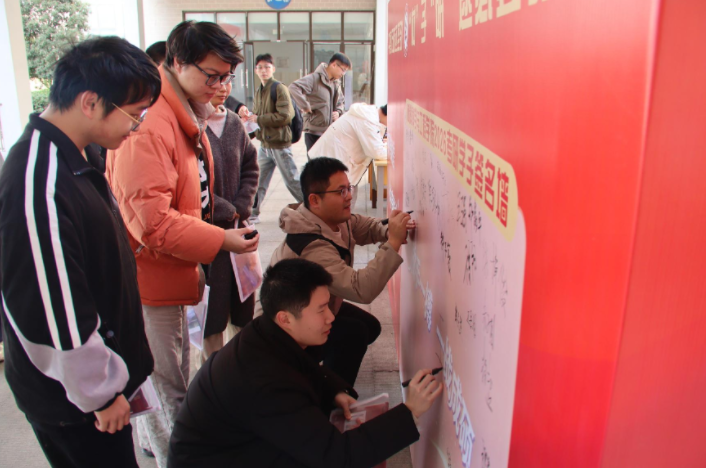 慰问现场,老师们为考研学子发放了精心准备的“助学礼包”。饱满的橙子寓意心想事“橙”,定制文具助力笔下生辉,手写祝福卡片传递真挚期盼。老师们还结合每位同学的实际情况,给予了个性化备考建议。同学们也纷纷在签名墙上留下诚信考试的承诺与对自己的寄语,展现出积极向上的备考风貌。
